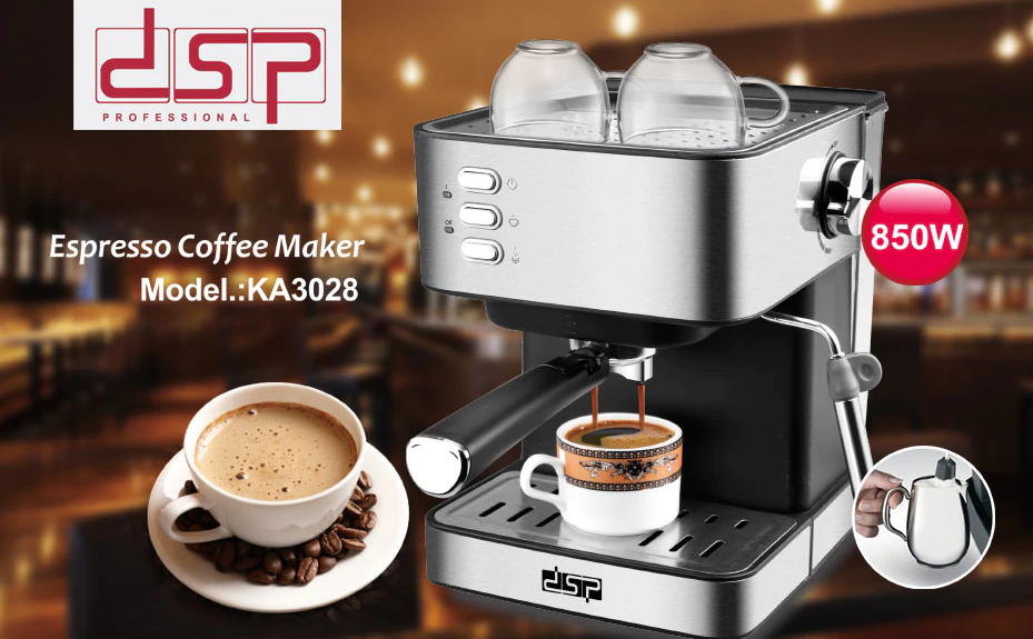 Për dashamirët e ekspresit, DSP ka krijuar makinën e ekspresit Ekspres me Kafe te Bluar KA3028 ! Është një aparat kafeje ergonomike, e cila funksionon me një presion pompe 15 bar dhe fuqi 850 W. Si rezultat ju ofrohet mundësia për të bërë një kafe të shijshme dhe aromatike në shtëpi! Ka një dalje avulli për të kënaqur edhe adhuruesit tuaj të kapuçinos, duke i lejuar ata të bëjnë lehtësisht dhe thjesht qumështin e tyre të preferuar me shkumë. Ka një sipërfaqe që ngrohet sipër për të mbajtur filxhanët tuaj në temperaturën e këshilluar për të përftuar 100% shijen dhe aromën e një kafeje si ajo e lokalit tuaj të preferuar. Kjo paisje pastrohet lehtë dhe ka një sistem efikas për ngrohje shumë të shpejtë të ujit.