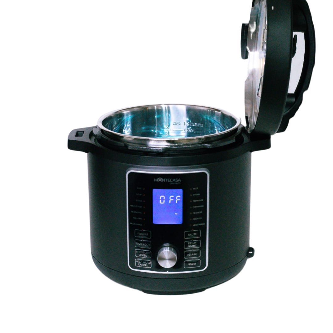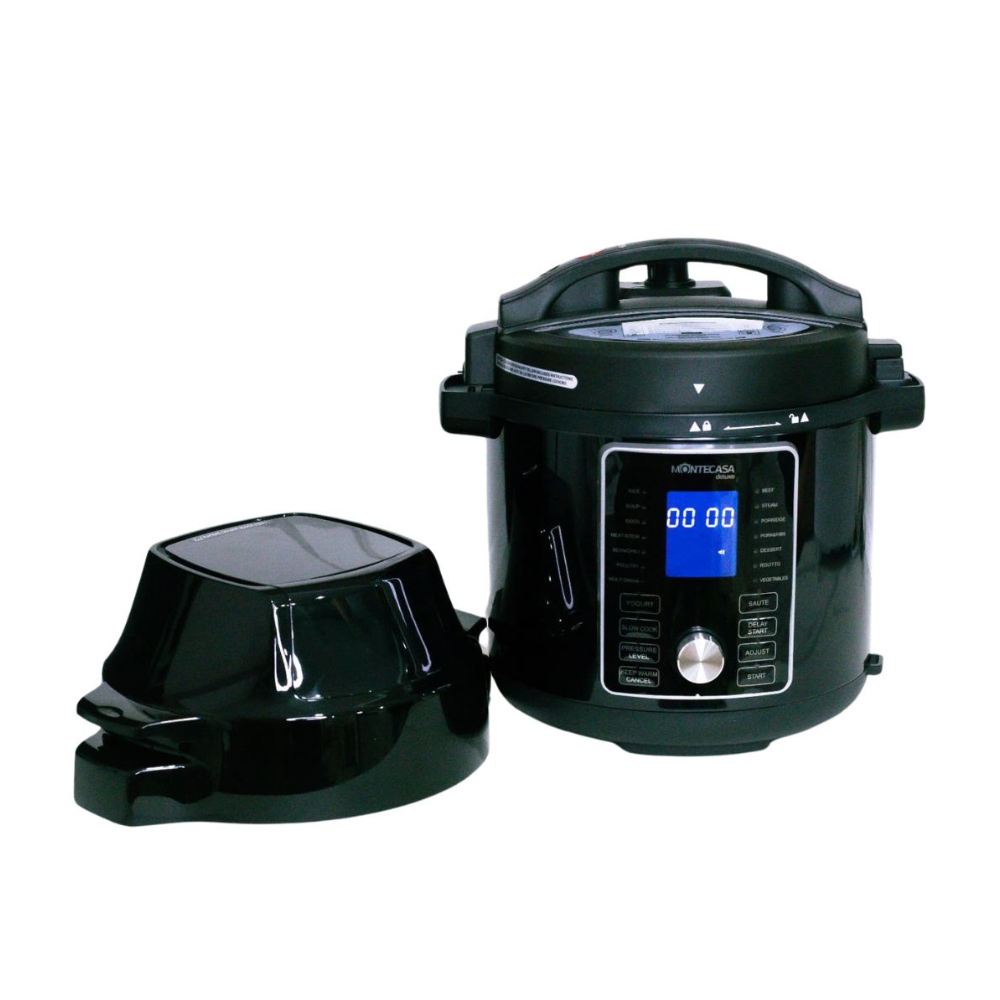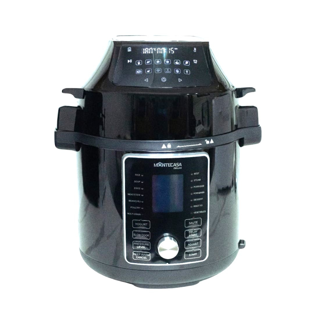 Multicooker & Air Fryer Montecasa Delux me 6L kapacitet, 1500W air fryer dhe 1000W multicooker. 30 programe gatimi, pjekje pa vaj dhe gatim me presion.