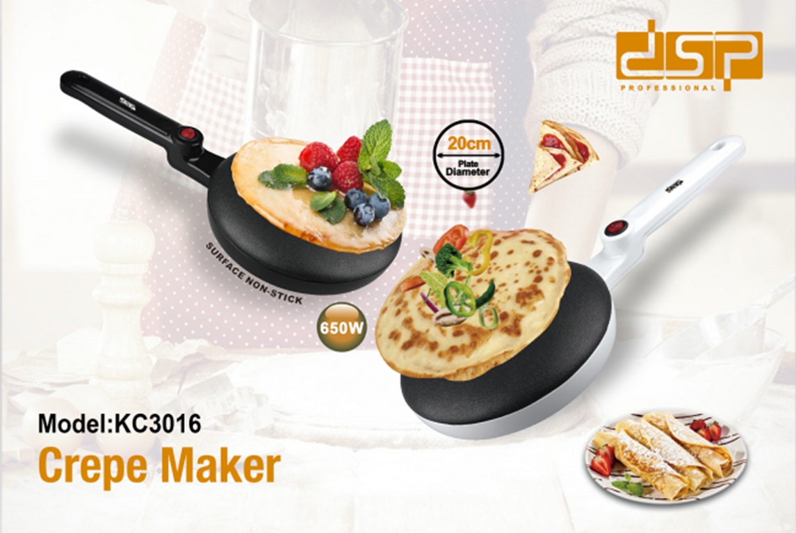 Pjekese Krepash 650W KC3016 DSP Professional ka sipërfaqe jo ngjitëse që ju lejon të bëni shpejt dhe me lehtësi shumë gatime të preferuara. Ajo bën krepa, tortilla të buta, taco, palaçinka, fletë vezësh, chapati etj. Bërja e mëngjesit zgjat vetëm 20 sekonda, madje edhe pa përvojë gatimi. Me këtë pajisje harrojeni tiganin tuaj të krepave.