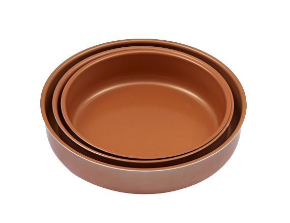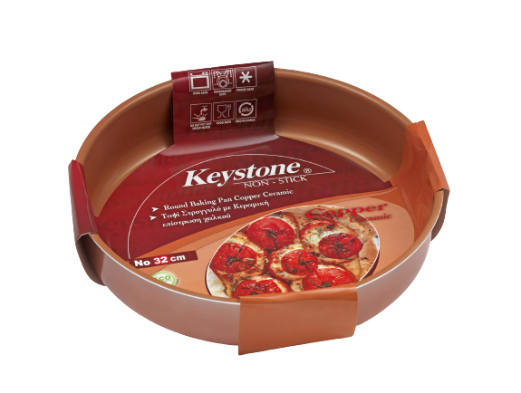 Tepsi Qeramik Bakri 28×6.5cm 3.45L KeystoneGR është prej alumini me veshje qeramikë bakri nga jashtë dhe nga brenda.