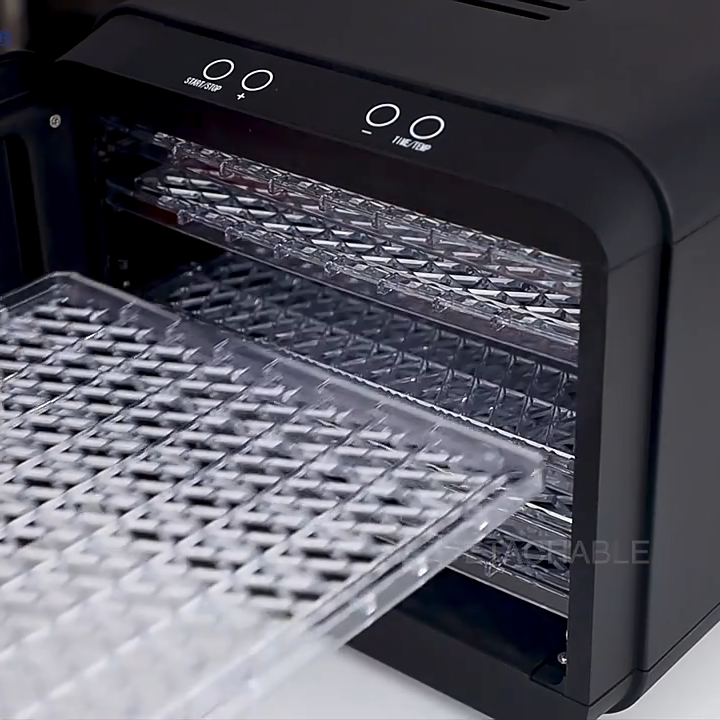Ajo vjen me 6 sirtarë plastikë të tejdukshëm, që lejojnë tharjen e një sasie të madhe ushqimesh në të njëjtën kohë. Sirtarët janë të lehtë për t’u pastruar dhe të qëndrueshëm në përdorim. Kontrolli i temperaturës dhe kohës realizohet lehtë përmes komandave të thjeshta në panelin e sipërm.