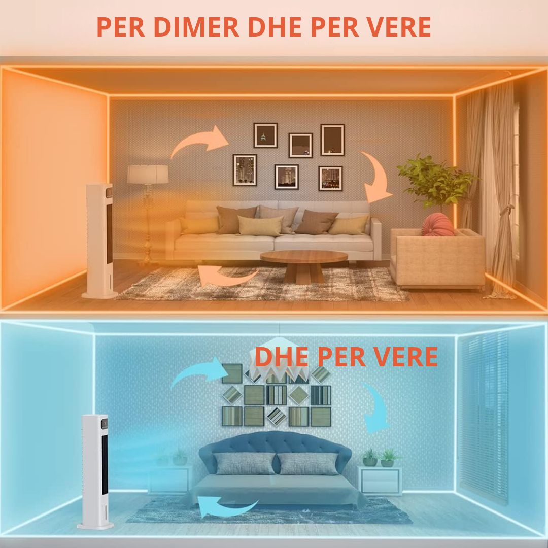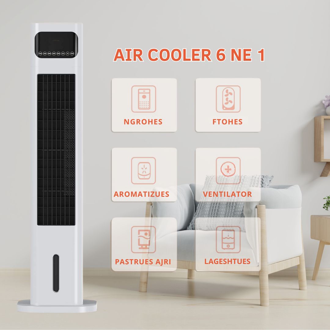 Air Cooler 3 ne 1 Ngrohes Ftohes Jonizues JF3000G 120/3000w Montecasa Premium gjatë procesit të ftohjes konsumon sa një ventilator 80 W, sepse ena 8 litroshe e ujit+akull (në se doni) siguron ajër të ftohtë, mjaftueshëm për një sipërfaqe salloni të madh.