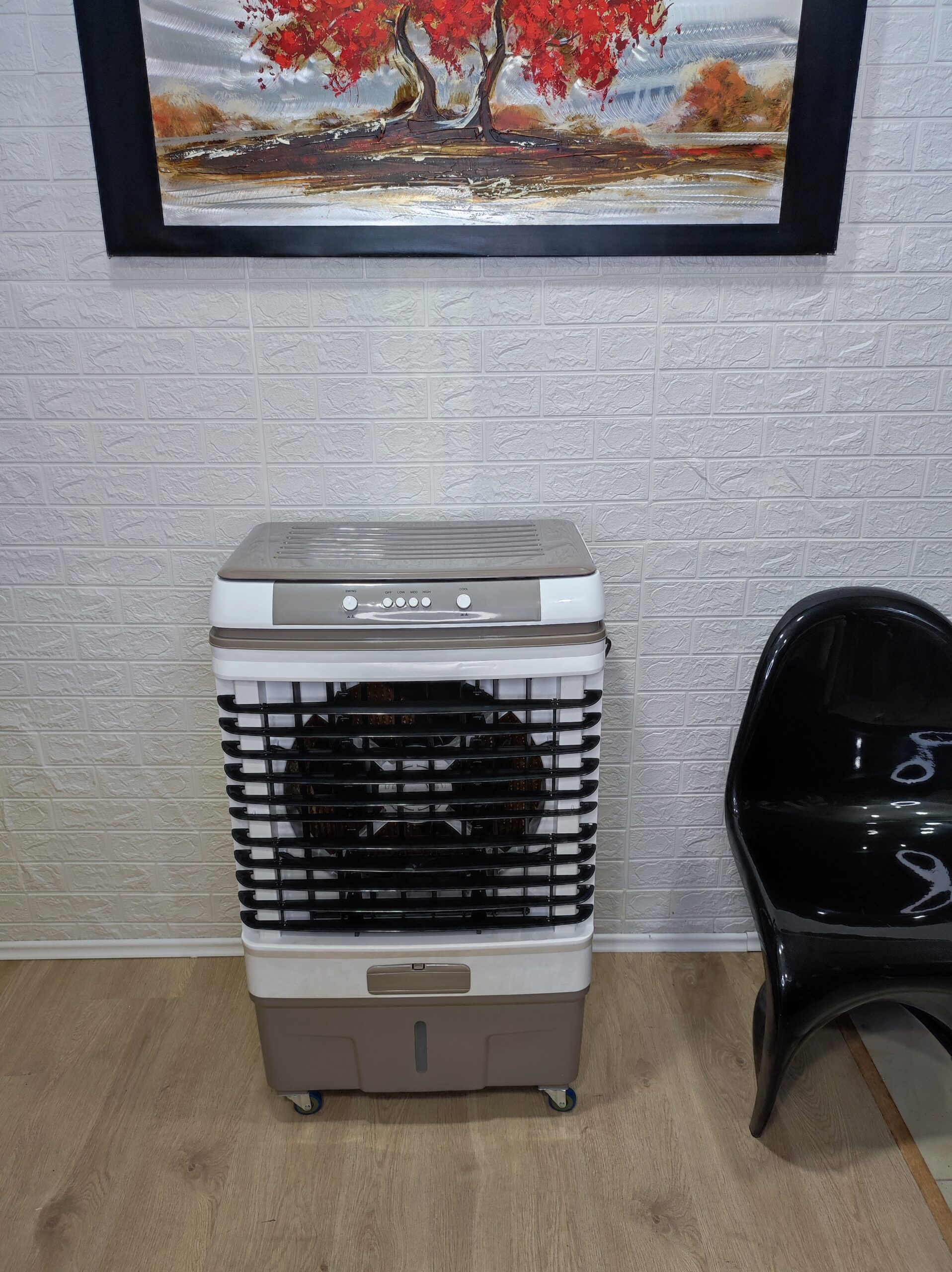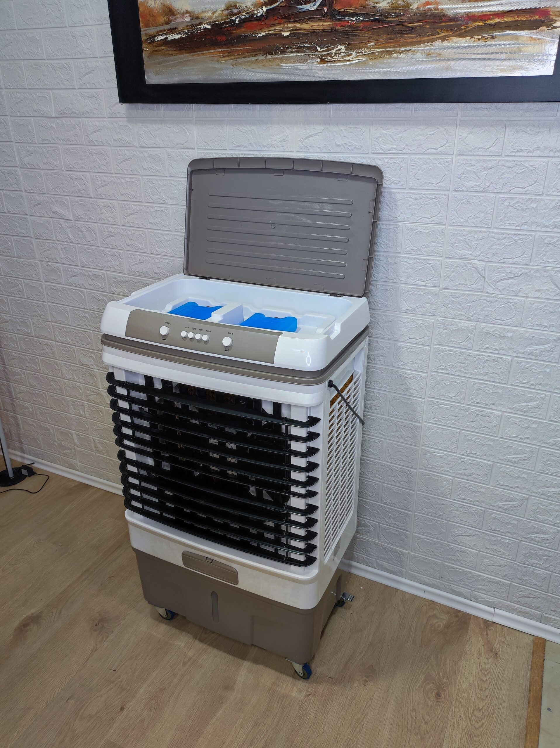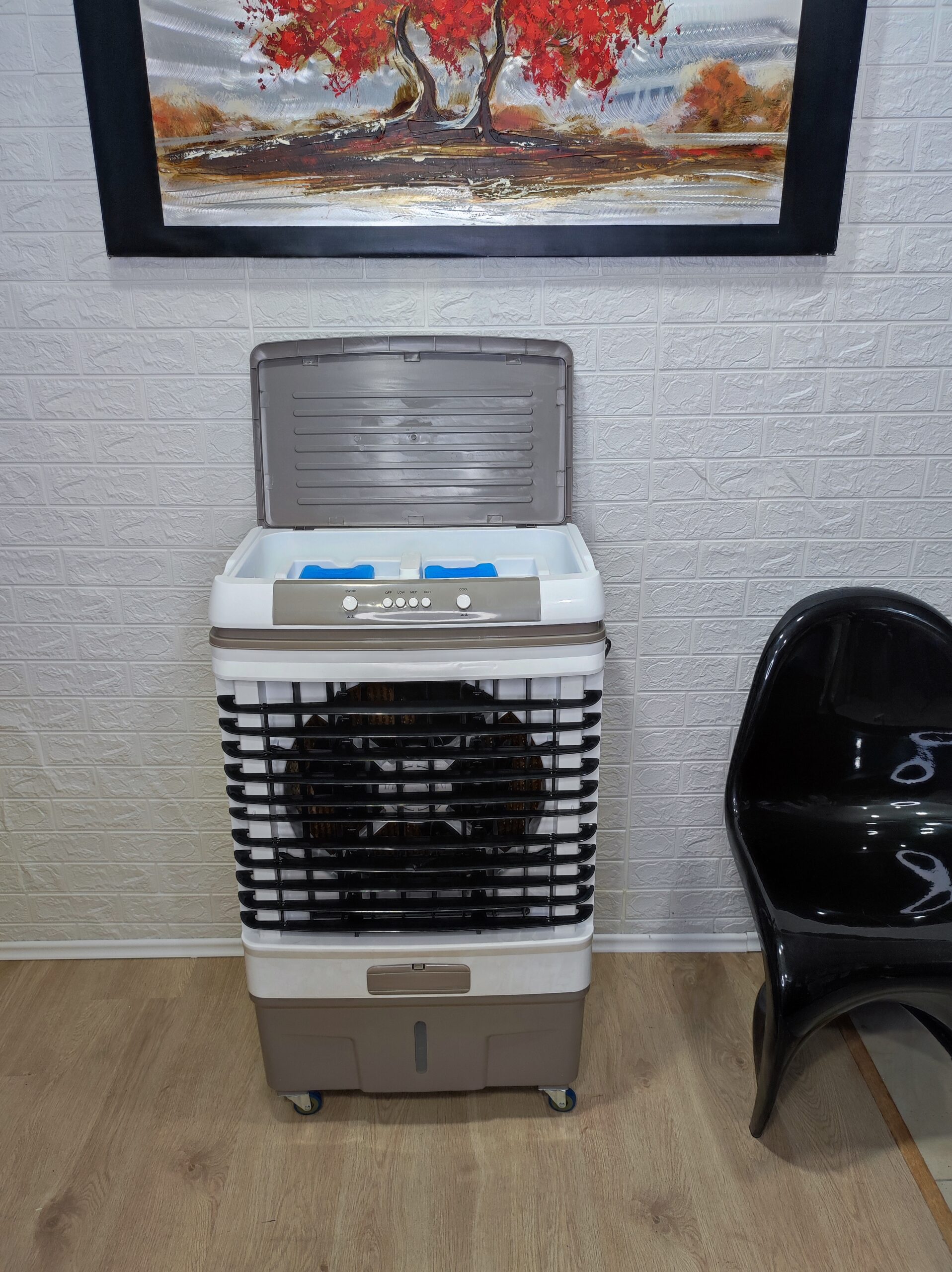 Air Cooler Freskues Portabel 50L 350w Professional gjatë procesit të ftohjes konsumon vetem 350W, ena 50 litroshe e ujit+akull (në se doni) siguron ajër të fresket, mjaftueshëm për një sipërfaqe salloni të madh 30-40m2.