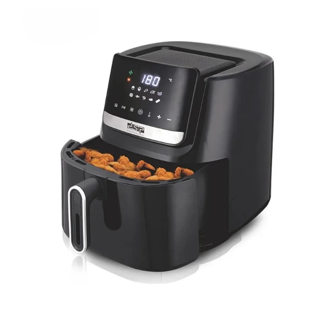 Fritezë me Ajër 7.5Lt 1600W KB2139 DSP Professional. Materiali i trupit: ABS+çelik inox+PP. Enë e brendshme e veshur me teflon.  Ekran LED me kontroll të panelit me prekje. 10 meny të paracaktuara. Kontrolli i temperaturës: 80-200℃. Kontrolli i kohës: 1-60 minuta. Me mikro-çelës, fikja automatike kur lëviz tenxheren. Aksesorët: tepsi për pjekje