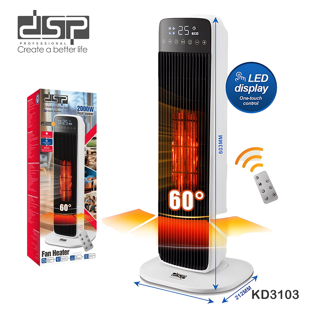 Ngrohës PTC DSP KD3103 është një ngrohës i avancuar vertikal, me teknologji të shpejtë dhe efikase PTC, i krijuar për të siguruar nxehtësi të menjëhershme dhe të sigurt gjatë gjithë dimrit. Ngrohës PTC DSP KD3103 punon me fuqi maksimale 2000W, ndërsa ofron edhe modalitet të ulët 1400W, për të kursyer energji në situatat kur nuk kërkohet shumë nxehtësi.