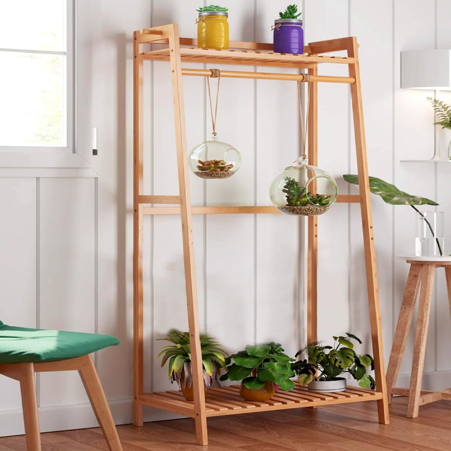 Raft Shumefunksional/Portmanto Bambu DK7719 mund të përdoret gjithashtu si raft shumëfunksional. Rafti i poshtëm i rëndë mund të ruajë vazot tuaja të mëdha; bimët e varura që mund të varen nga shufra e sipërme; 2 grepa mund të përdoren për të varur çanta, kapele, çadra etj