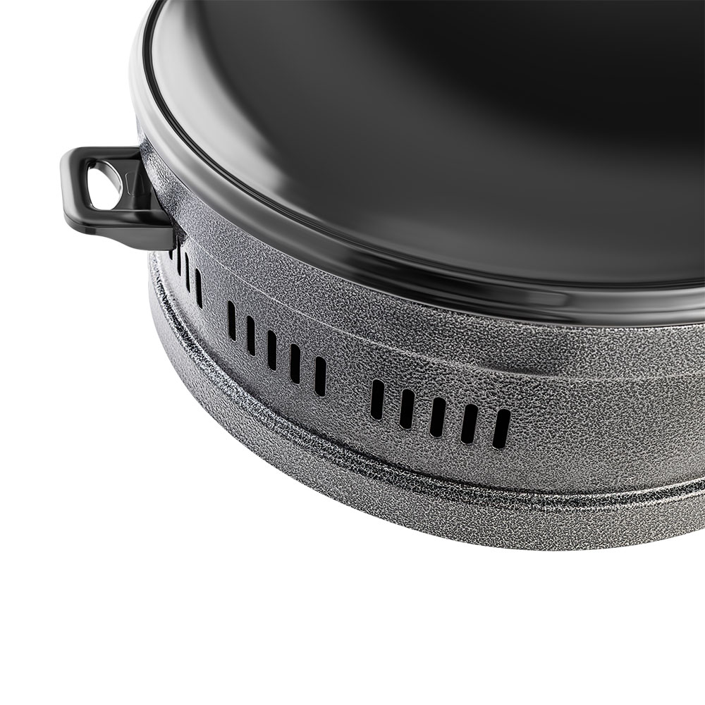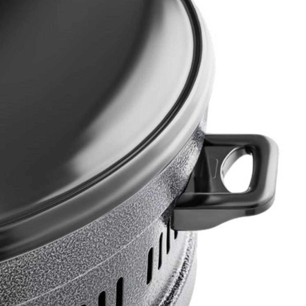 Saçi ka trup metalik të fortë me shtresë rezistente ndaj nxehtësisë dhe goditjeve. Kapaku i mbyllur ruan temperaturën, rrit efikasitetin dhe e bën pjekjen më uniforme. Dorëzat anësore janë të izoluara nga nxehtësia, duke e bërë pajisjen të sigurt dhe të lehtë për t’u lëvizur.
