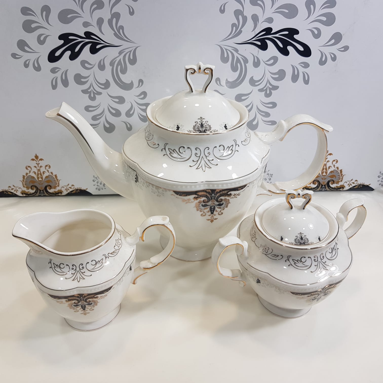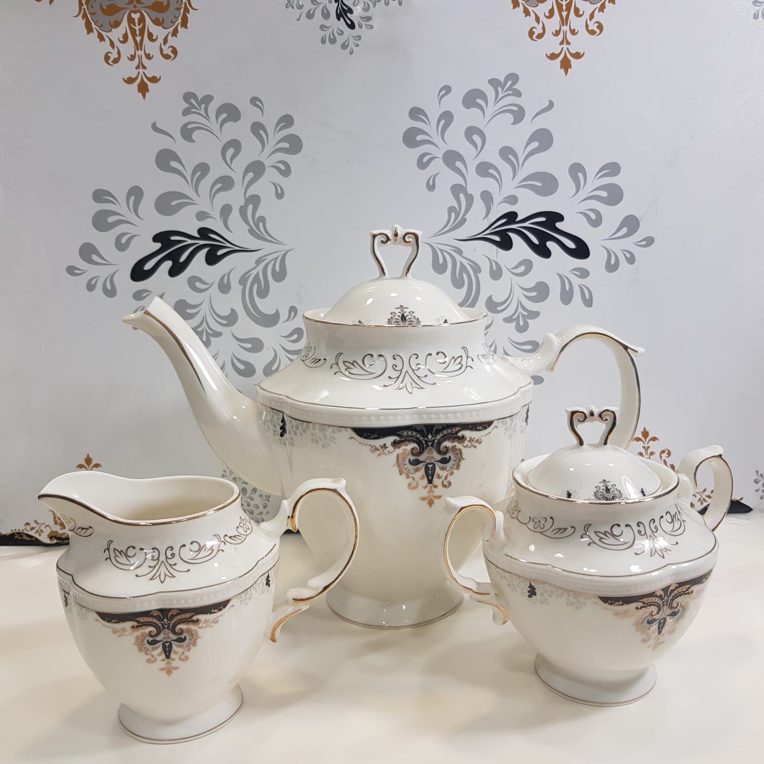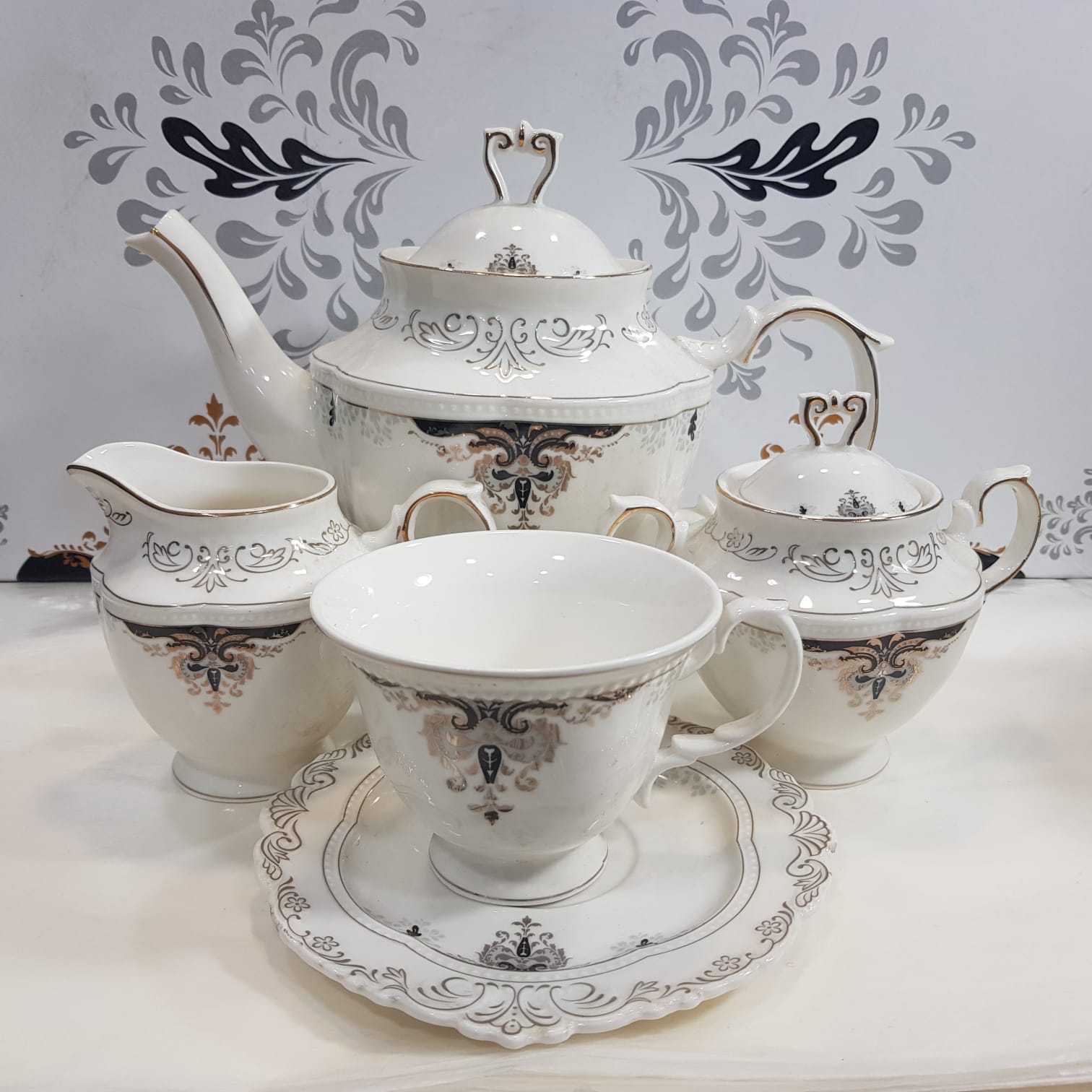 Jepini më shumë shije dhe stil çajit tuaj me këtë set filxhanësh dhe pjatash porcelani me stil klasik. Ai është zbukuruar me rifinitura të arta dhe detaje elegante. Seti përfshin 6 flixhanë me pjata, një çajnik, një mbajtëse qumështi dhe një mbajtëse sheqeri. Ky set është prodhuar me dorë me teknologjinë tradicionale BONE CHINA.