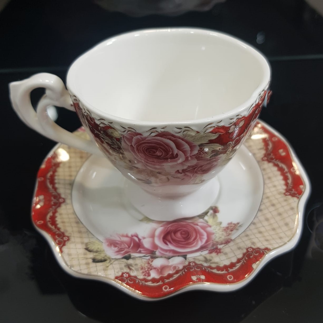 Jepini më shumë shije dhe stil kafes tuaj me këtë set filxhanësh dhe pjatash porcelani me stil klasik. Ai është zbukuruar me dekorime florale dhe detaje elegante. Seti përfshin 6 flixhanë me pjata me reliev. Ky set është prodhuar me dorë me teknologjinë tradicionale BONE CHINA.