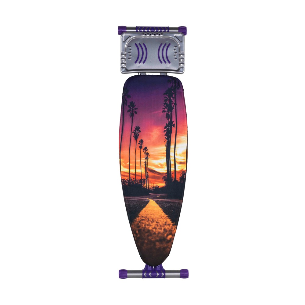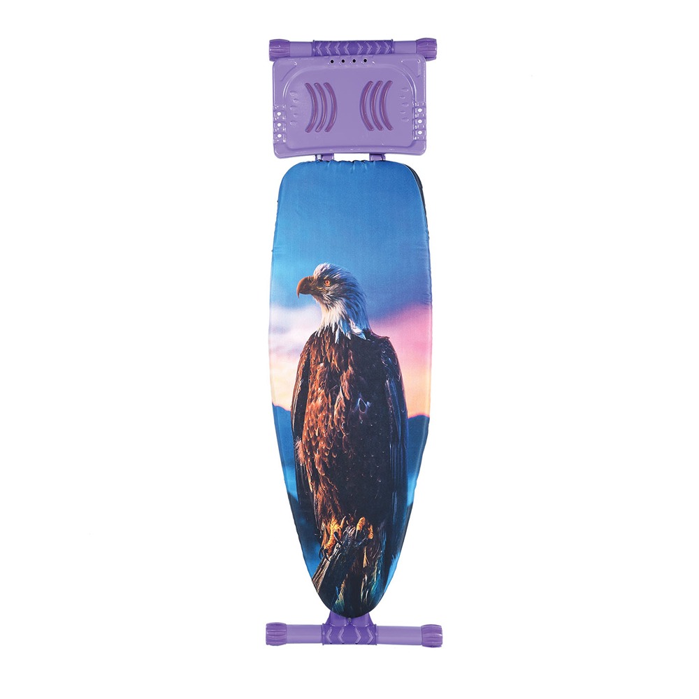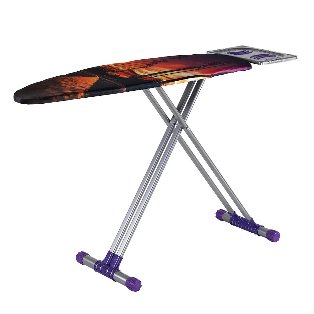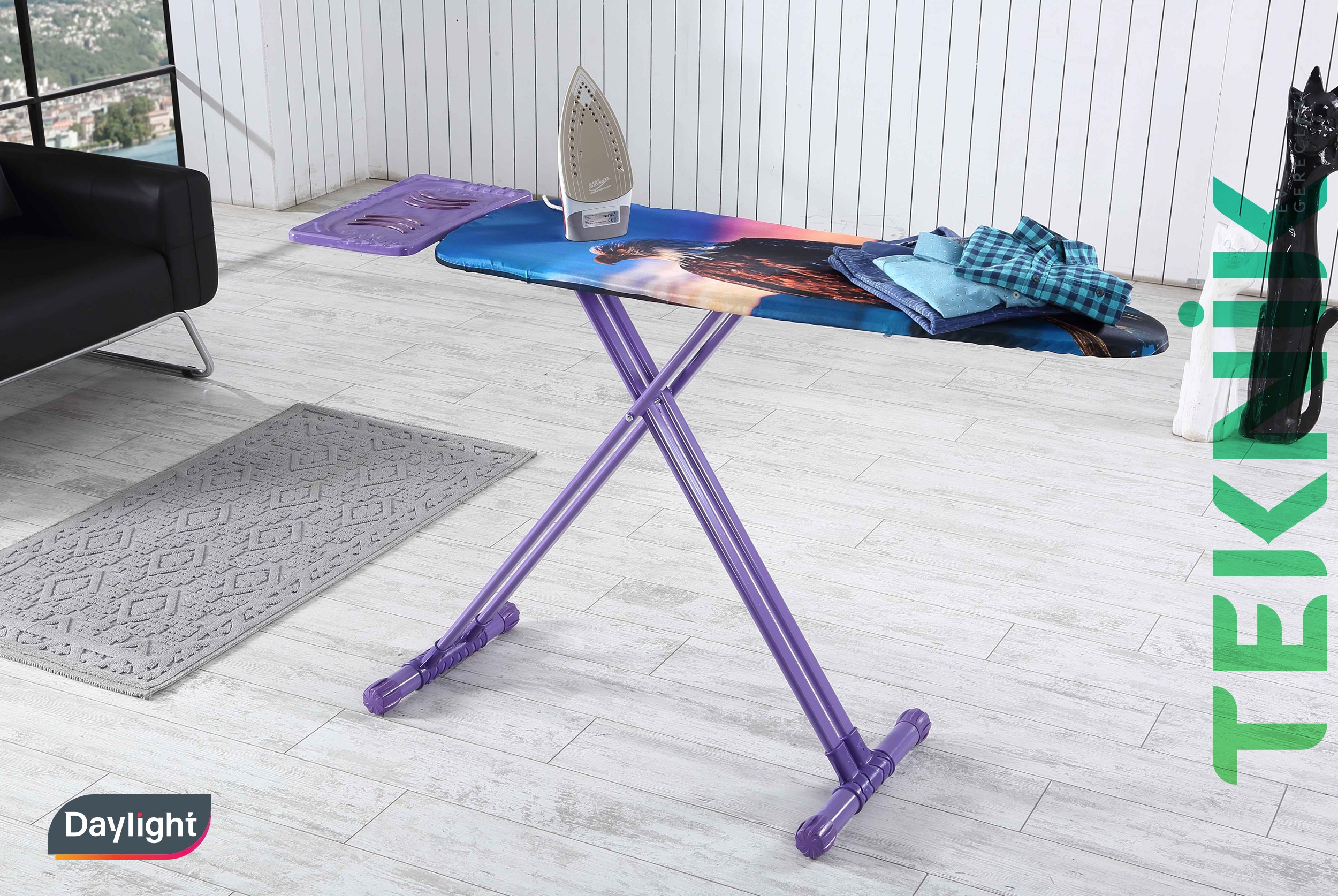 Dërrasa e hekurosjes është monoblok çeliku i presuar dhe i përforcuar, duke garantuar stabilitet gjatë përdorimit dhe jetëgjatësi të lartë. Sipërfaqja është e mbuluar me pëlhurë pambuku shumëngjyrëshe dhe rezistente ndaj nxehtësisë, që i jep një pamje të freskët dhe ruan sigurinë edhe gjatë përdorimit të zgjatur.