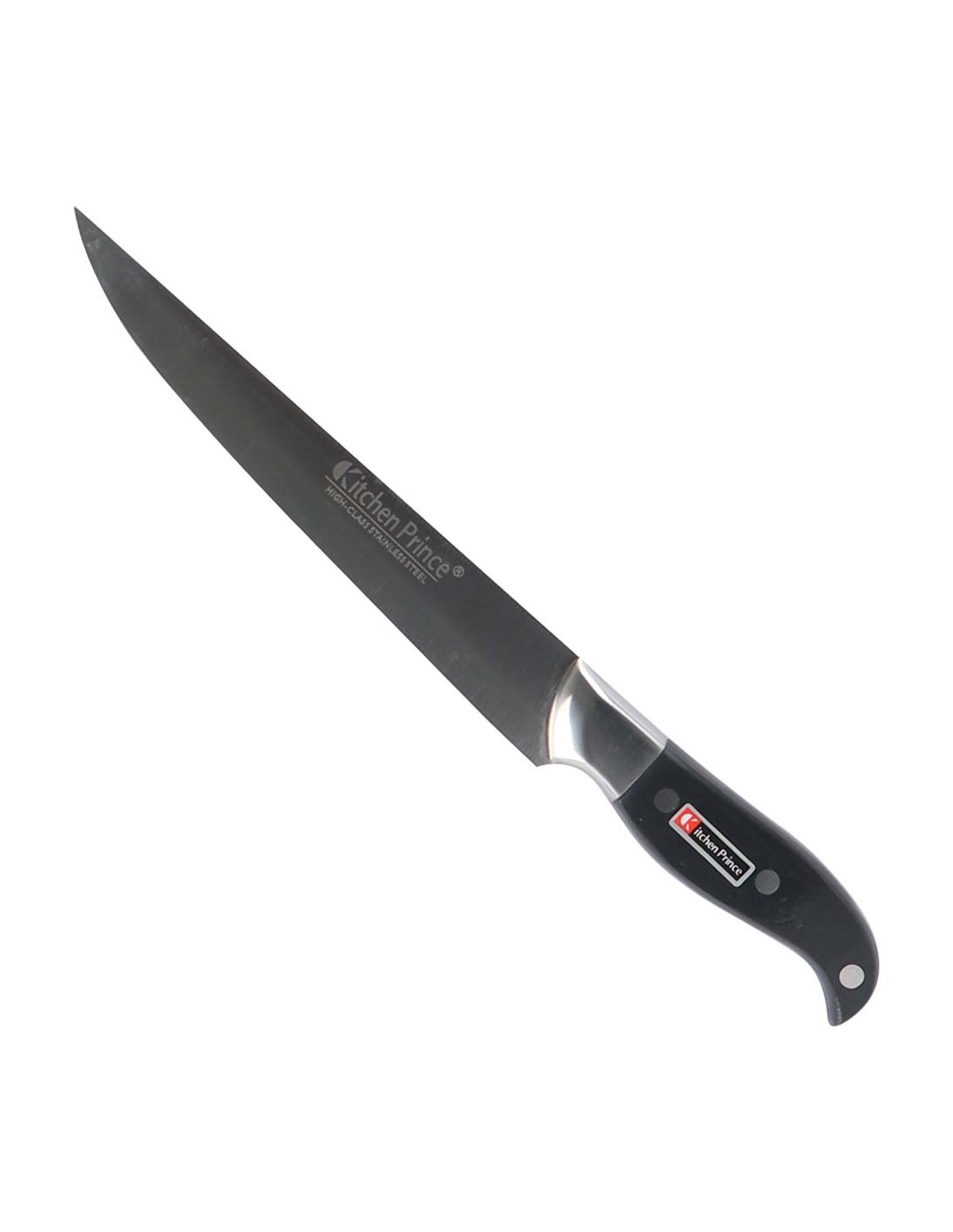 Thikë Mishi 32cm EU031256 Kitchen Prince® me teh inox dhe dorezë plastike ABS e perforcuar me inoks i bën edhe detyrat e përditshme më të veçanta, më të lehta. E krijuar për të prerë gjithçka nga mishi, peshku dhe perimet. Prodhuar me çelik inox cilësor, tehu 19 cm është rezistent dhe funksional. Doreza e saj ka trajtim të veçantë antibakterial dhe kundër myqeve. Thika është e derdhur në një kallëp me dorezën dhe është formësuar me rrahje.