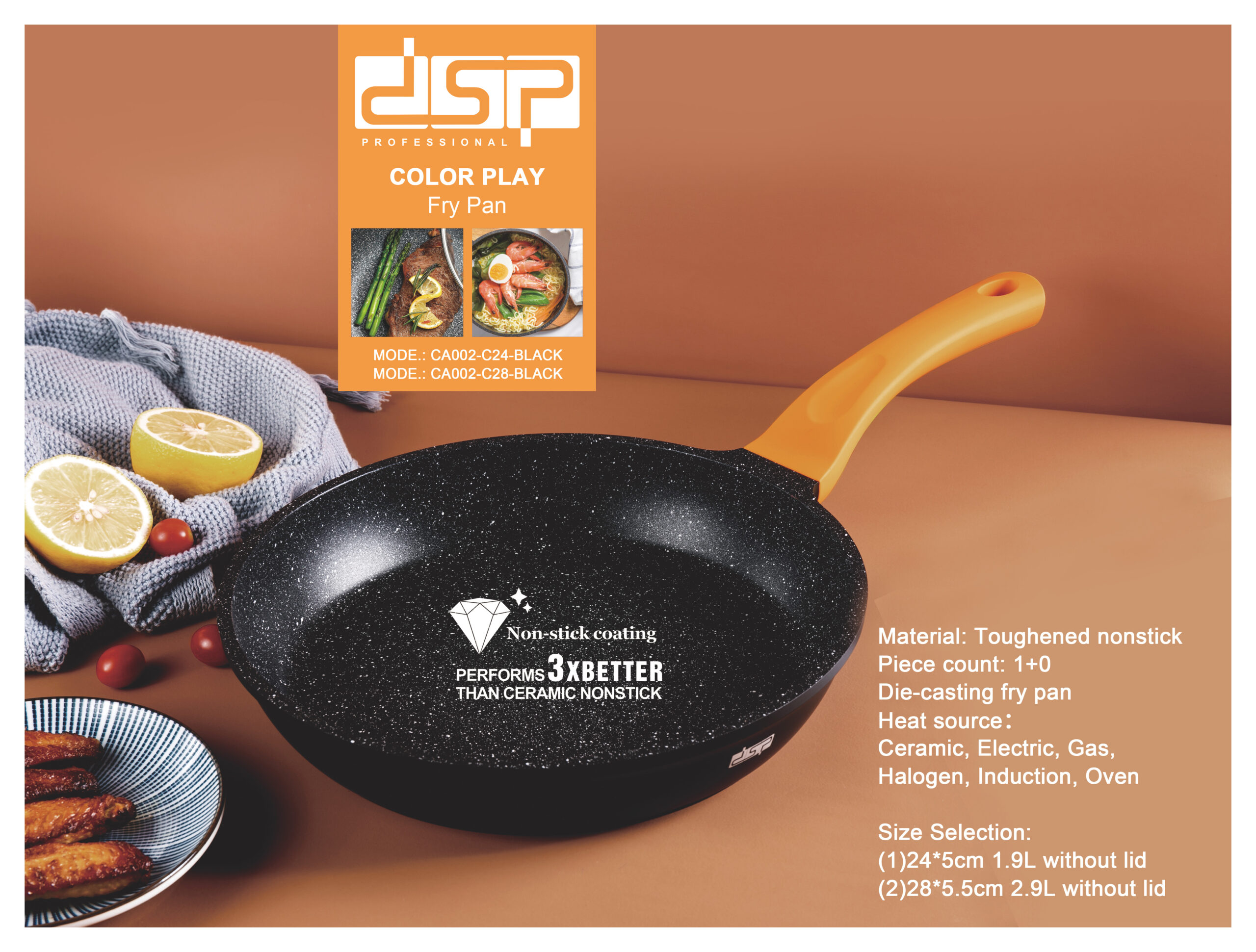 Tigan Me Veshje Guri Me induksion CA002-C28 BLACK DSP Professional është nga gama e re jo ngjitëse premium. Ajo është e bërë nga alumini i derdhur 4,5 mm i trashë për rezultat absolutisht solid, i përshtatshëm për zjarr, pjanur elektrike qeramik, infrared, halogjen. Dy tiganet bashkohen me anene e mje magneti te dorezat. Tigani vjen me dy guanicione silikoni.